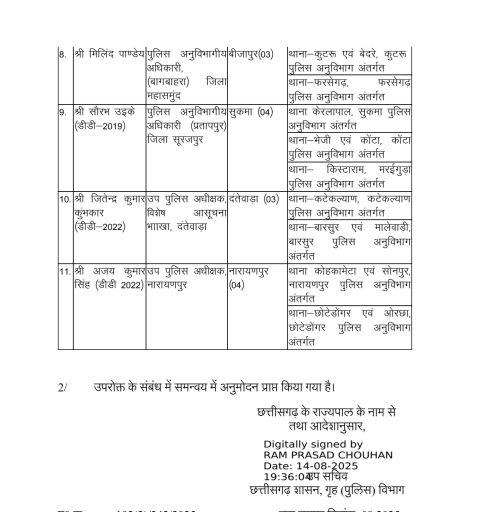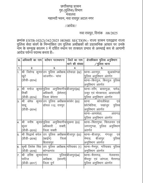 जारी आदेश के अनुसार, जांजगीर-चांपा में पदस्थ DSP जितेंद्र कुमार खुंटे को दंतेवाड़ा, बेमेतरा में पदस्थ मनोज कुमार तिर्की को बीजापुर, रायपुर में पदस्थ योगेश कुमार साहू को कांकेर, सक्ती में पदस्थ मनीष कुमार कुंवर को सुकमा, बिलासपुर में पदस्थ सिद्धार्थ बघेल को बीजापुर, कोण्डागांव में पदस्थ लितेश सिंह को गरियाबंद, दुर्ग में पदस्थ हरिश कुमार पाटिल को बीजापुर, महासमुंद में पदस्थ मिलिंद पांडेय को बीजापुर, सूरजपुर में पदस्थ सौरभ उइके को सुकमा, दंतेवाड़ा में पदस्थ जितेंद्र कुंभकार को दंतेवाड़ा, नारायणपुर में पदस्थ अजय कुमार सिंह को नारायणपुर जिले में ही (थाना बारसुर, मालेवाड़ी, कोहकामेटा, सोनपुर, छोटेडोंगर, ओरछा) की जिम्मेदारी दी गई है।