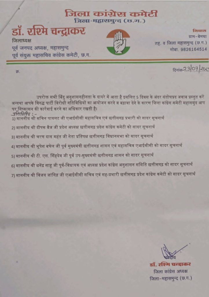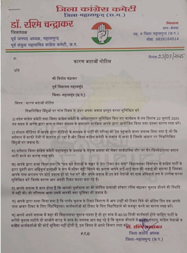 रायपुर। महासमुंद के पूर्व विधायक और वरिष्ठ कांग्रेस नेता विनोद चंद्राकर को पार्टी कार्यक्रम में अनुपस्थित रहने और अनुशासनहीनता के आरोप में कारण बताओ नोटिस जारी किया गया है। यह नोटिस महासमुंद ज़िला कांग्रेस कमेटी की अध्यक्ष रश्मि चंद्राकर की ओर से भेजा गया है।