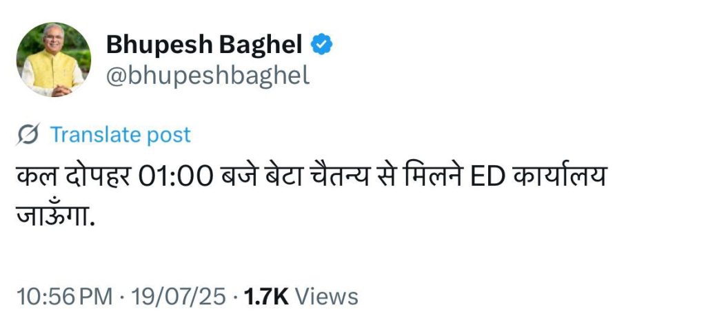 पूर्व सीएम भूपेश बघेल ने सोशल मीडिया एक्स पर पोस्ट भी किया है. उन्होंने पोस्ट साझा करते हुए कहा कि “कल दोपहर 01:00 बजे बेटा चैतन्य से मिलने ED कार्यालय जाऊंगा.”