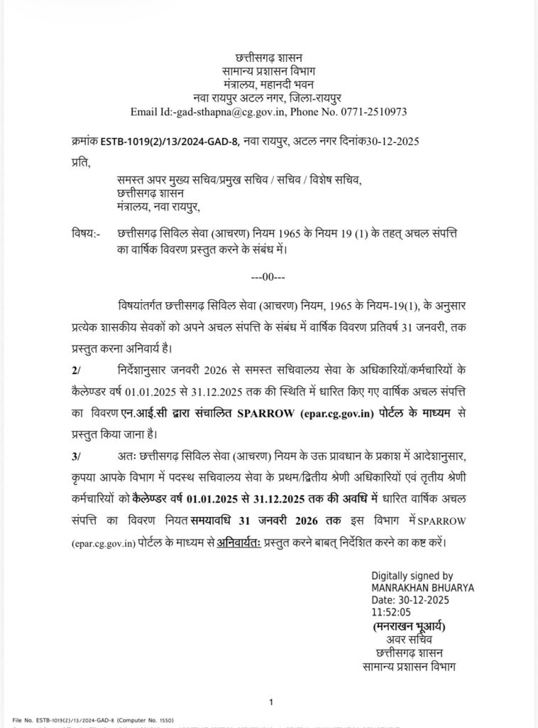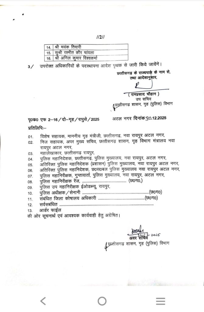 9. मंत्रिपरिषद द्वारा पुलिस मुख्यालय छत्तीसगढ़ नवा रायपुर अटल नगर में विशेष कर्तव्यस्थ अधिकारी का एक नवीन पद वेतन मेट्रिक्स लेवल-14 एक वर्ष की अवधि के लिए स्थायी रूप से निर्मित किए जाने की स्वीकृति प्रदान की गई है।