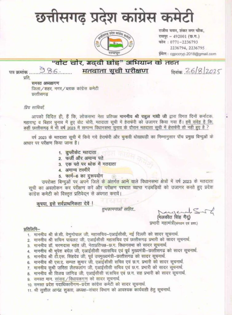 छत्तीसगढ़ में फर्जी वोटरों को ढूंढेगी कांग्रेस : सभी जिलाध्यक्षों को PCC ने जारी किया आदेश