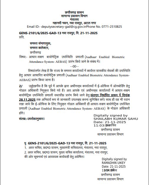 छत्तीसगढ़ में अब सभी सरकारी दफ्तरों में आधार-आधारित बायोमेट्रिक अटेंडेंस लागू करने की तैयारी तेज, GAD ने कलेक्टरों को जारी किया आदेश
