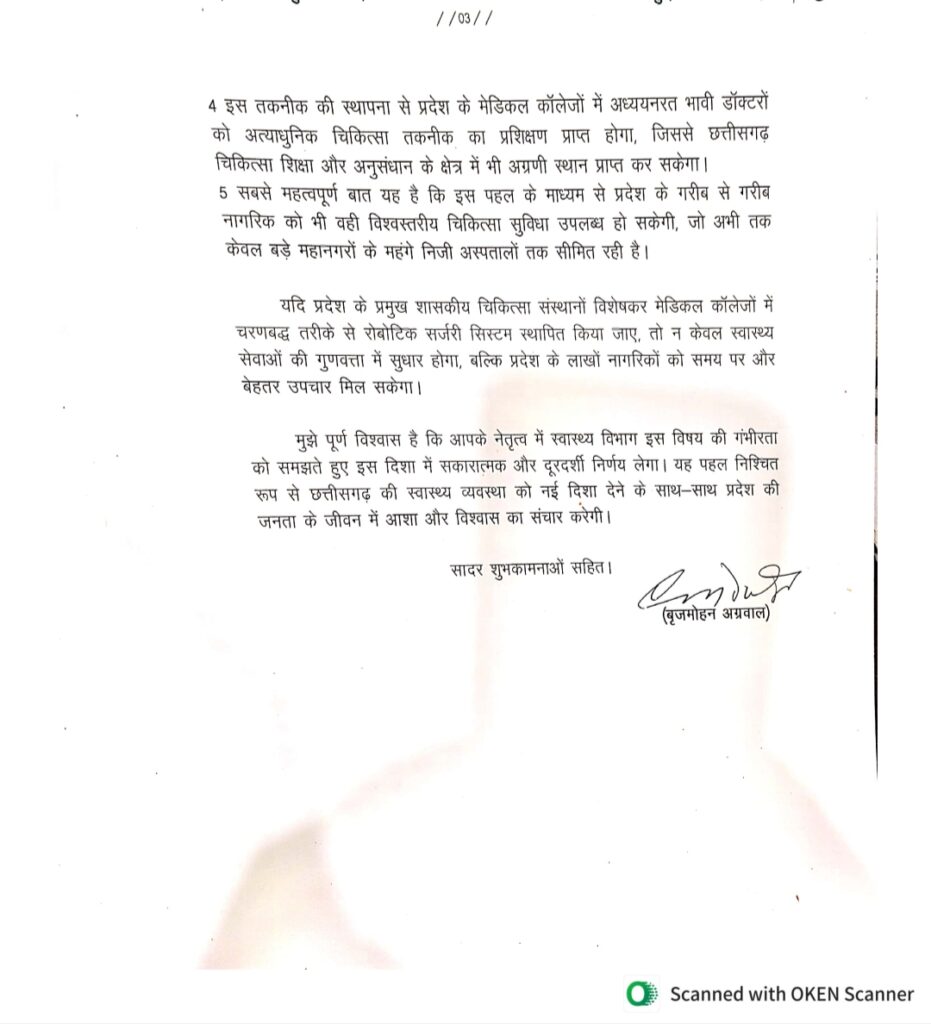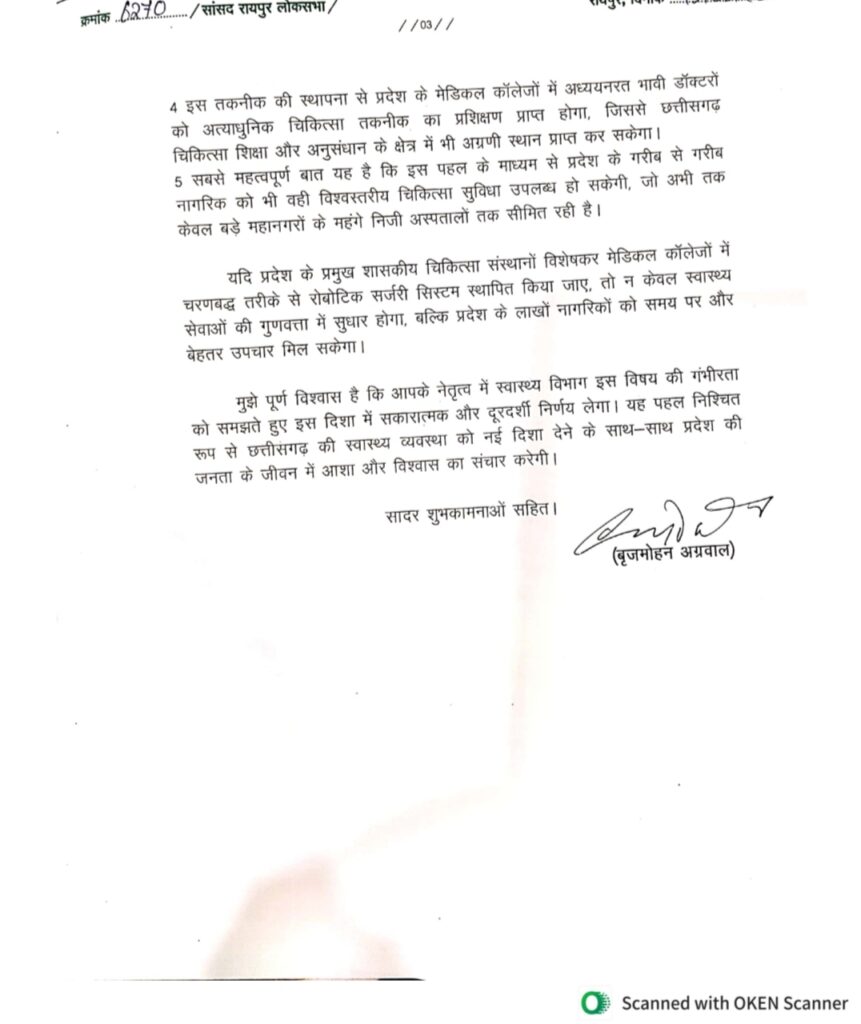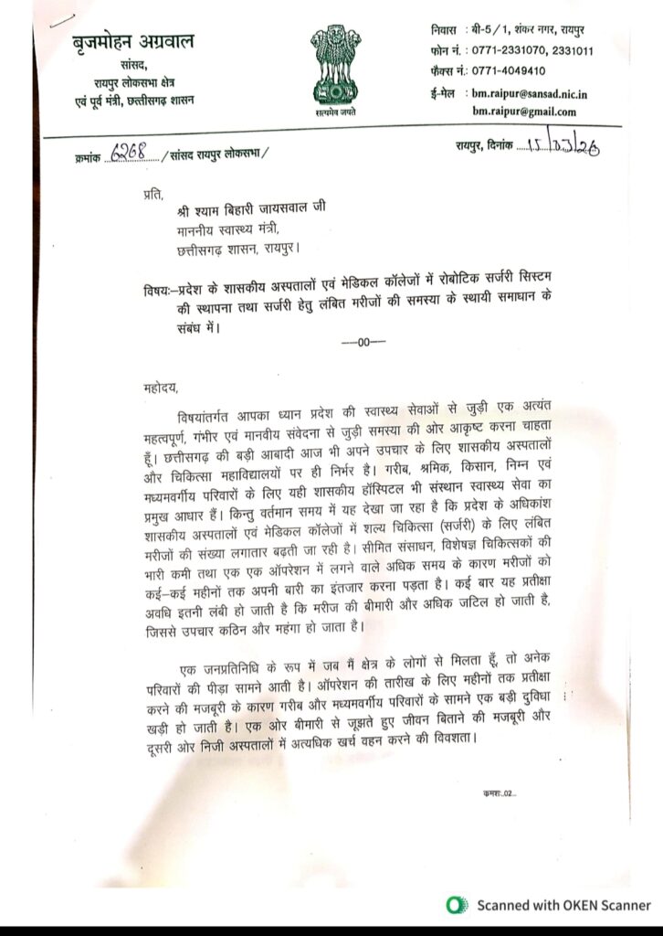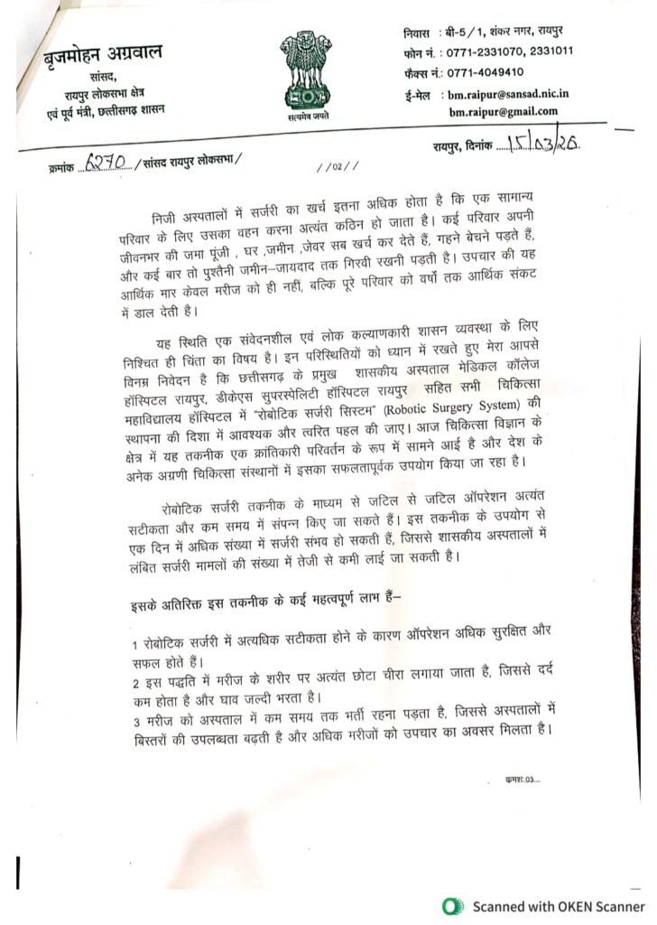 प्रदेश में आधुनिक स्वास्थ्य क्रांति की पहल: सांसद बृजमोहन अग्रवाल ने की शासकीय अस्पतालों में रोबोटिक सर्जरी सिस्टम स्थापित करने की मांग- मुख्यमंत्री, स्वास्थ्य मंत्री को लिखा पत्र